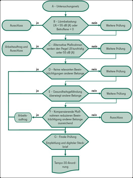 Für eine rechtssichere Anordnungsgrundlage einer nächtlichen Geschwindigkeitsreduktion von 50 km/h auf 30 km/h aus Lärmschutzgründen sind die in der Abbildung dargestellten Arbeitsschritte für die vertiefend zu prüfende Untersuchungskulisse erforderlich.